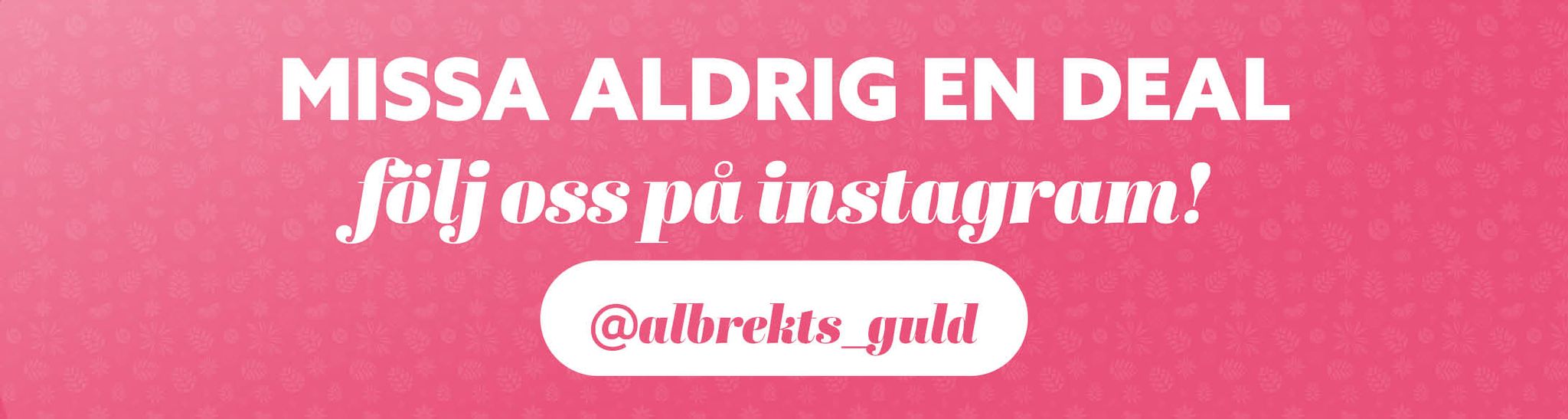 Vi på Albrekts Guld erbjuder ett brett sortiment av diamant-, guld- och silversmycken samt ett stort utbud av presentartiklar, pärlor, bijouterier, matsilver och klockor. Sedan starten 1977 har Albrekts Guld köpt in direkt från tillverkaren för att alltid kunna erbjuda lägsta möjliga pris. Hos oss hittar du ringar, förlovnings- och vigselringar, örhängen, halsband och armband. Vi har allt från enklare bijouterier till mer exklusiva smycken. Hos Albrekts Guld gör du alltid en bra affär! Välkommen till våra butiker eller shoppa online.